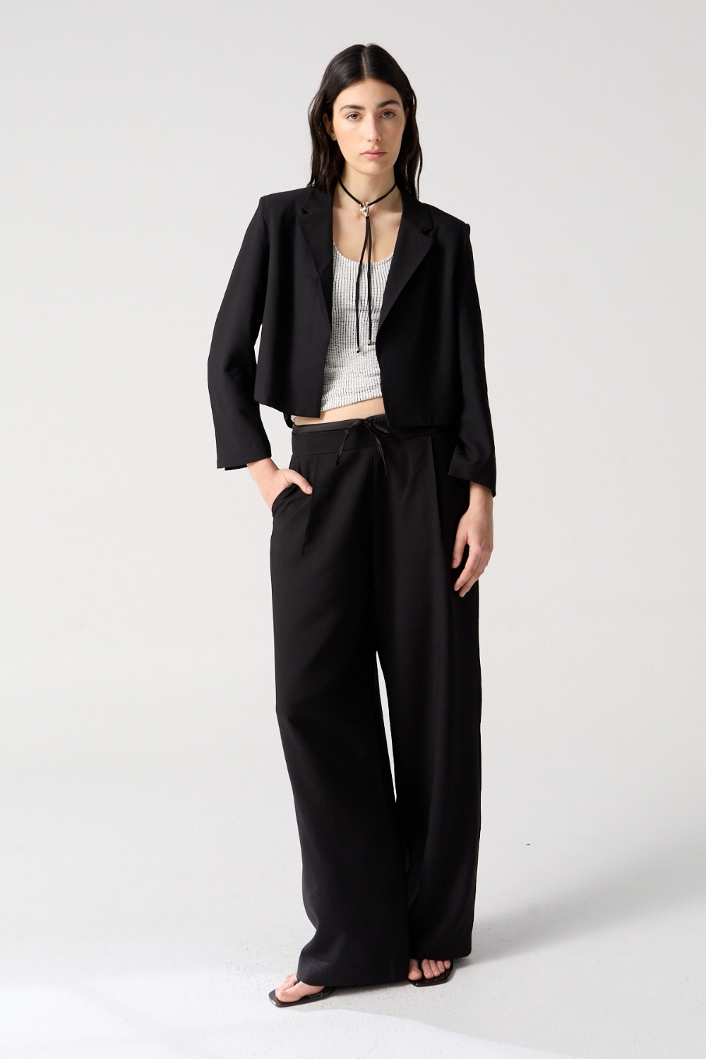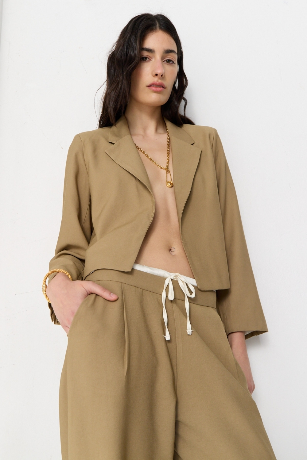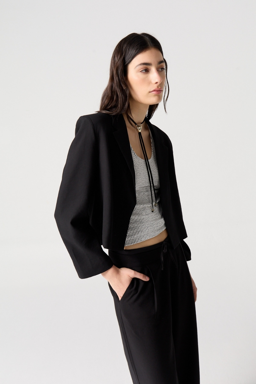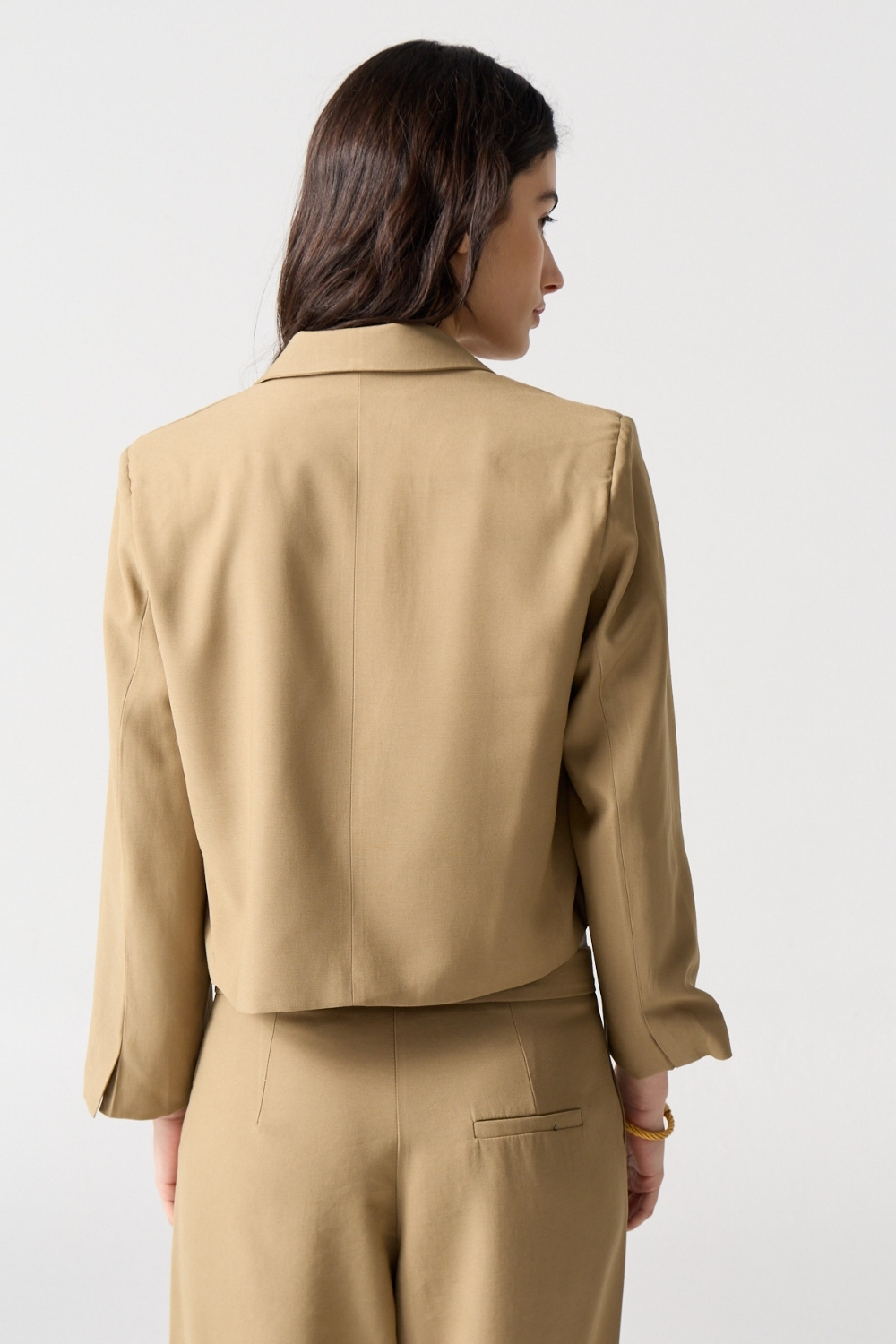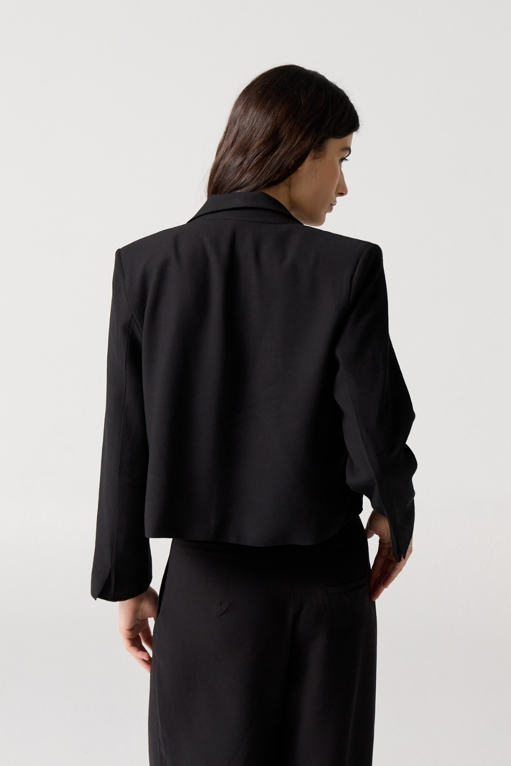 Blazer crop sin cruce confeccionado en textil sastrero liviano. Forrado al tono y con hombreras que aportan estructura y elegancia.