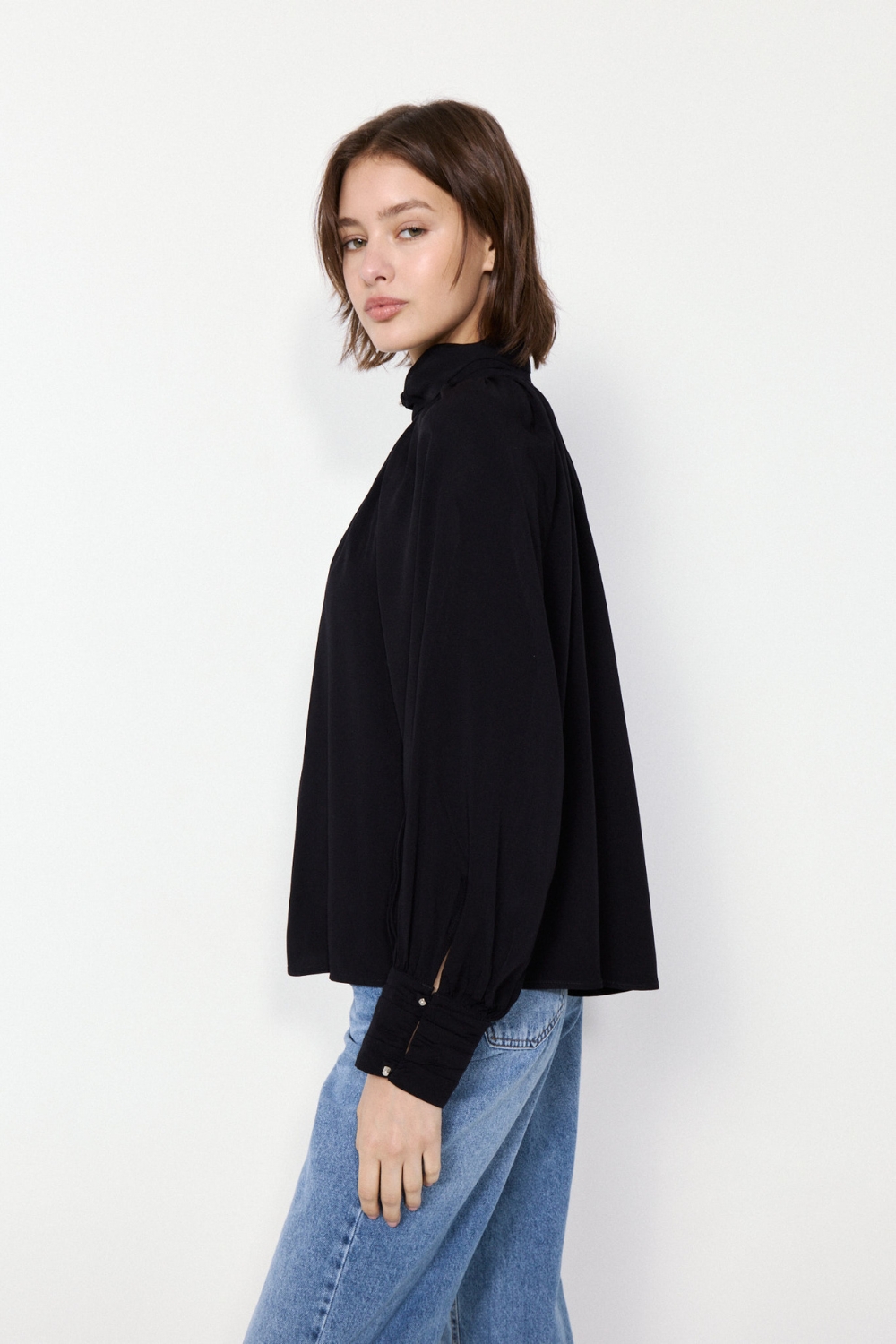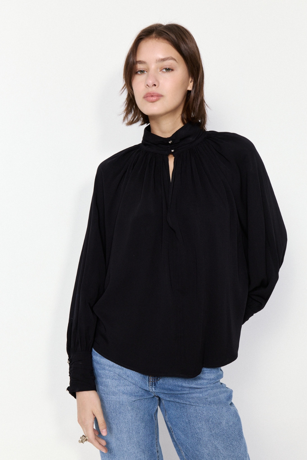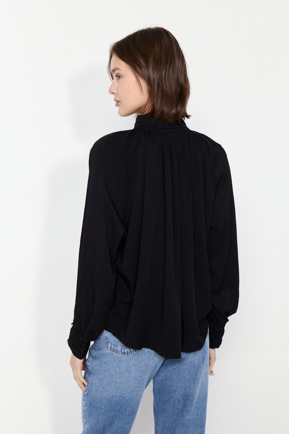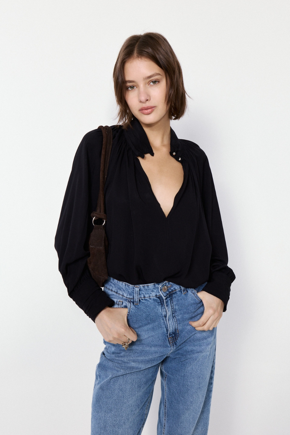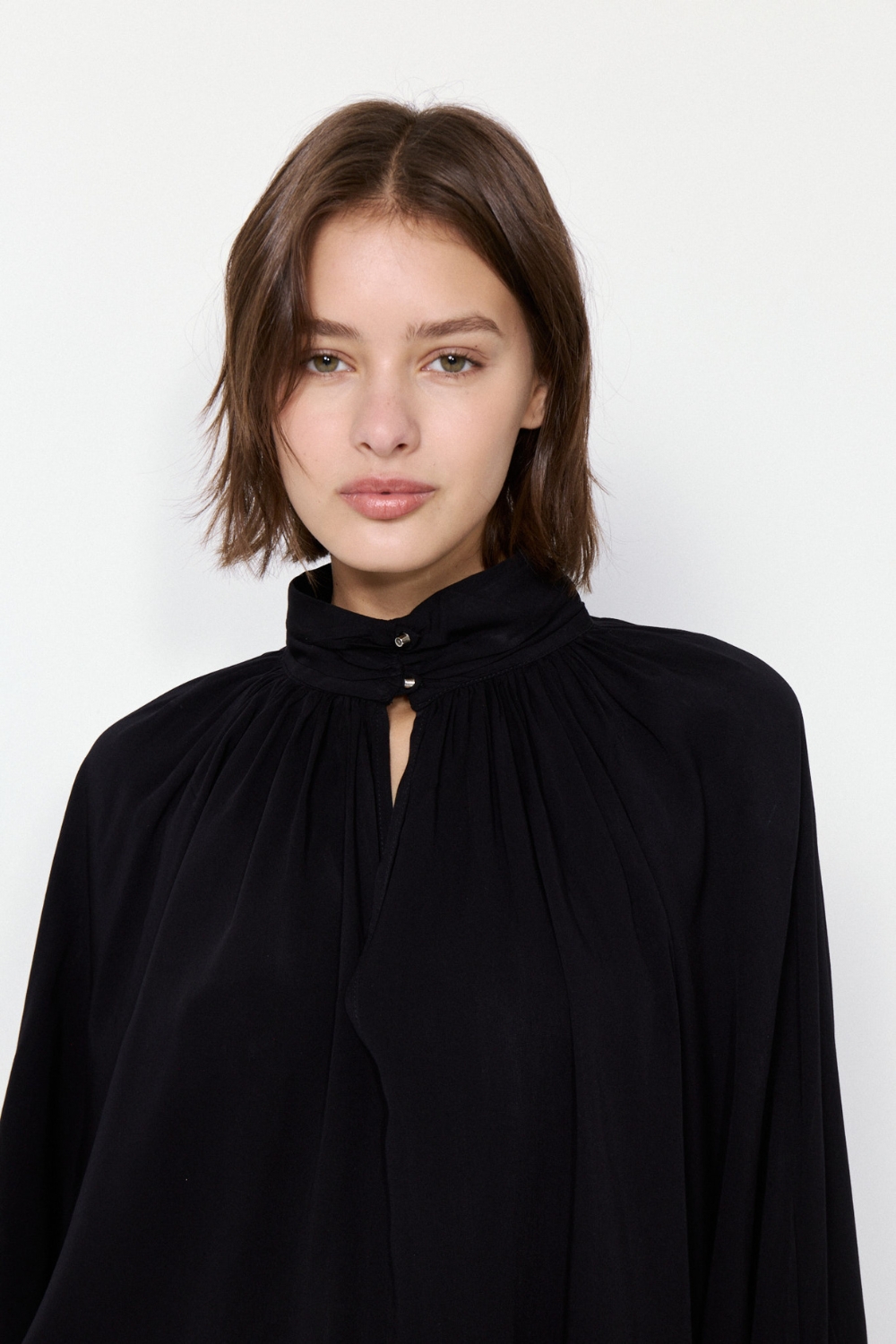 La Blusa Borough es una prenda con abertura delantera y detalles drapeados que aportan sofisticación. Su textil de excelente caída y calce relajado garantizan comodidad.