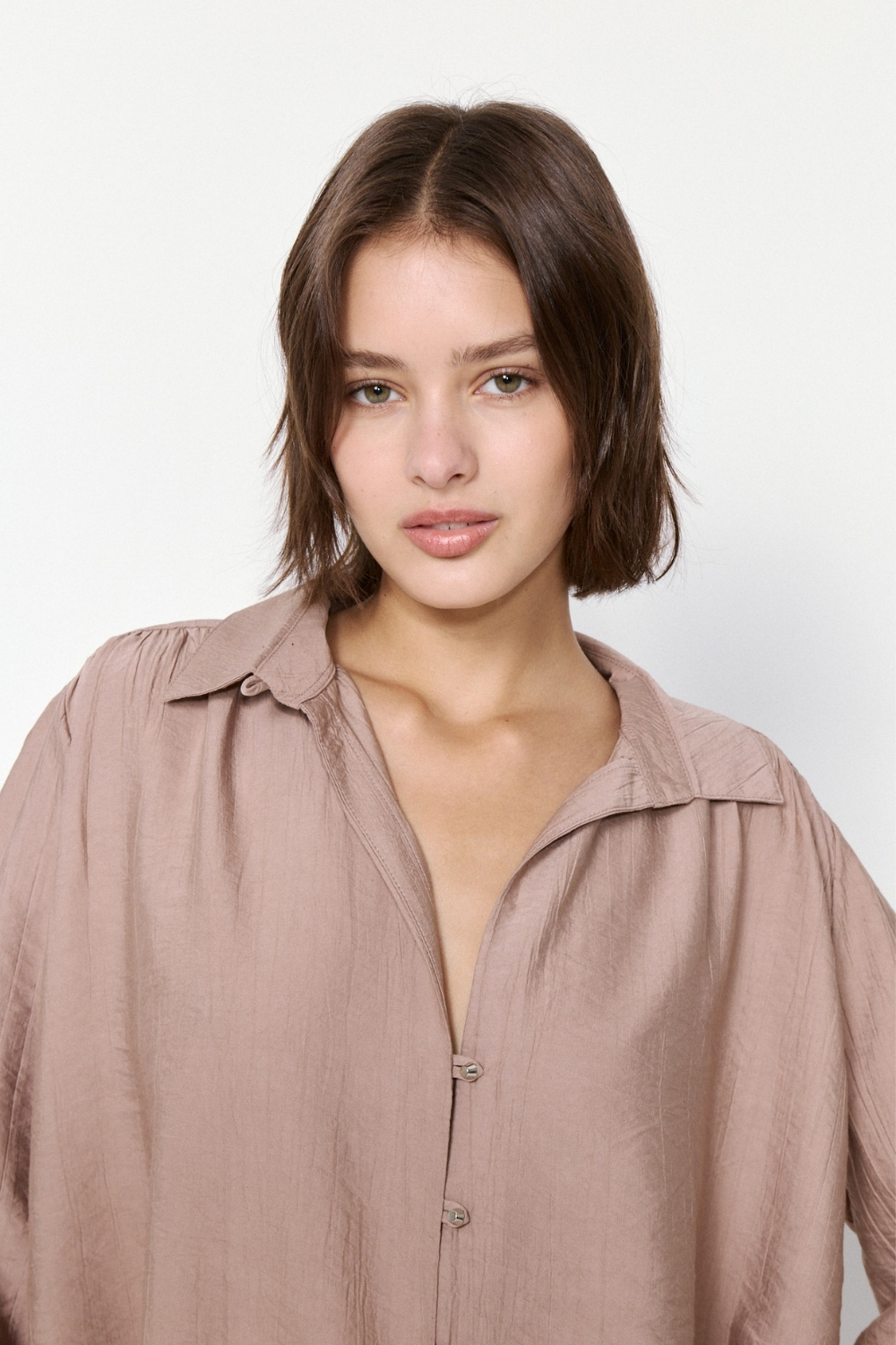 Camisa oversize de caída suave, con largo por debajo del glúteo. Incluye bolsillo delantero, botones al tono y detalle metálico de la marca.