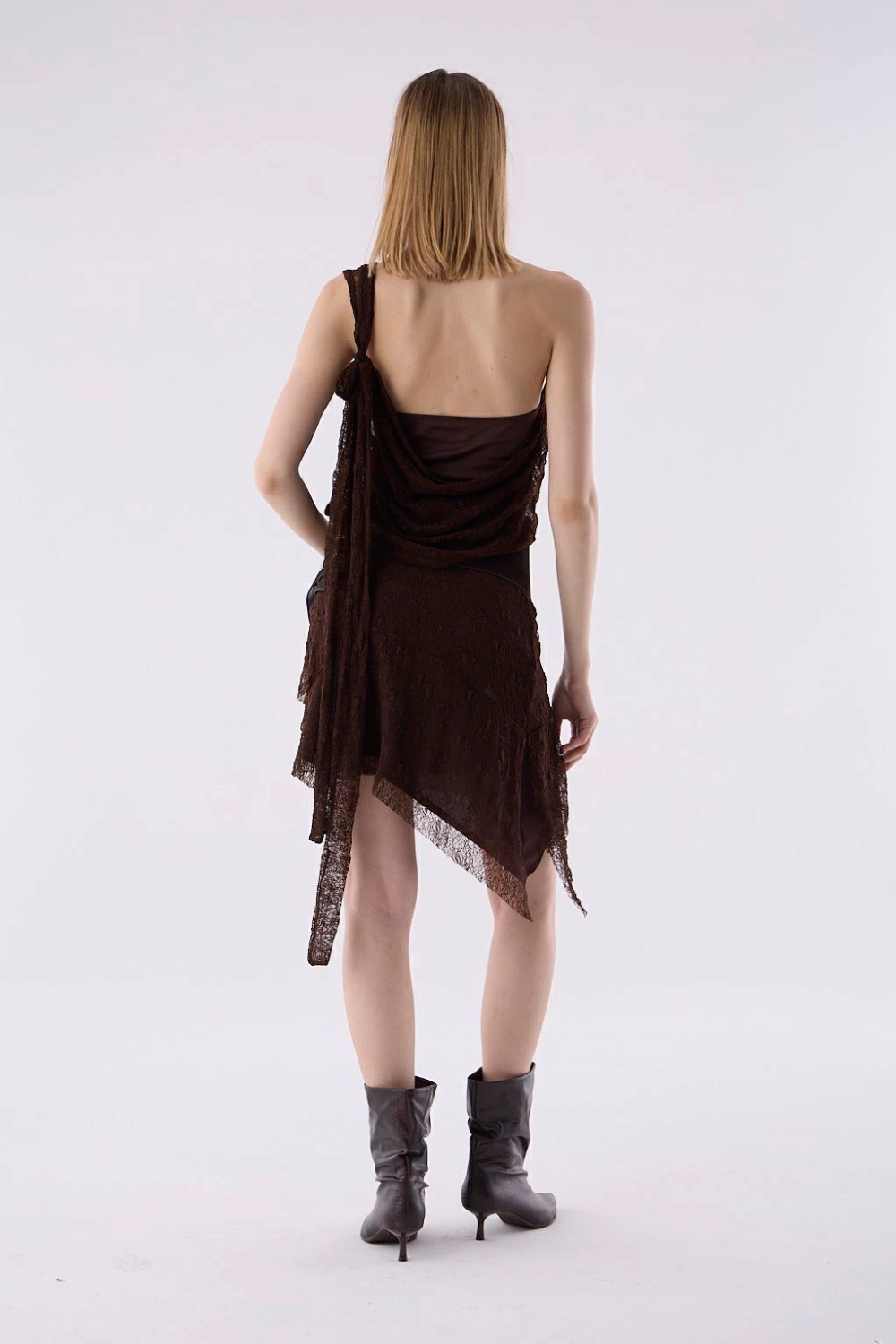 Blusa de un hombro con buche en escote delantero y espalda. Incluye top interior de jersey que se asoma en el escote. Corte recto y calce cómodo en encaje y jersey.