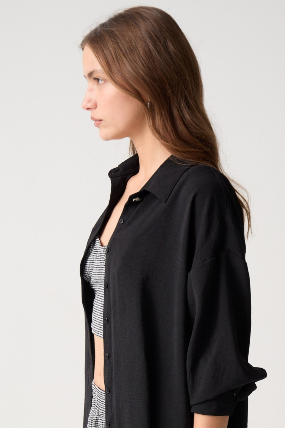 Camisa oversize de caída suave, con largo por debajo del glúteo. Incluye bolsillo delantero, botones al tono y detalle metálico de la marca.