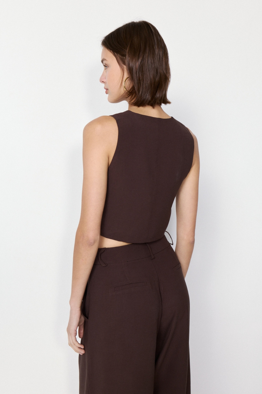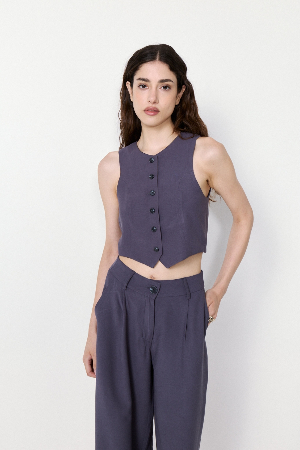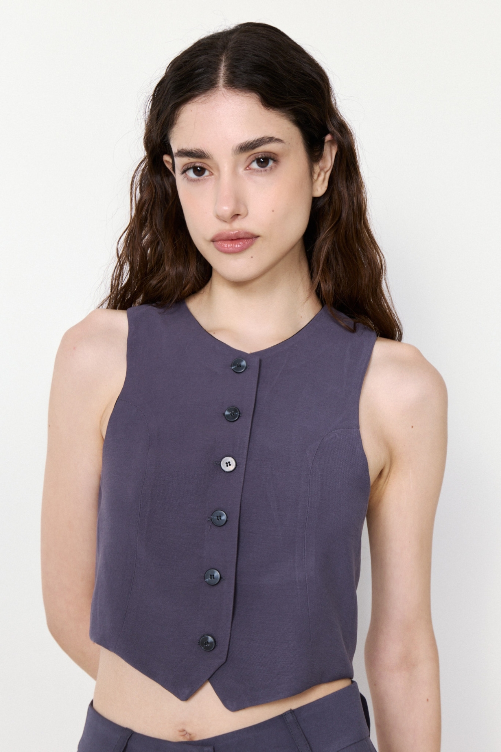 El CHALECO BARCADE es un chaleco sastrero en textil tipo tencel, de ajuste entallado que realza la figura. Su escote cerrado y forro al cuerpo aportan elegancia y confort.