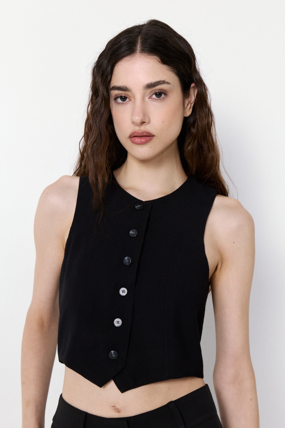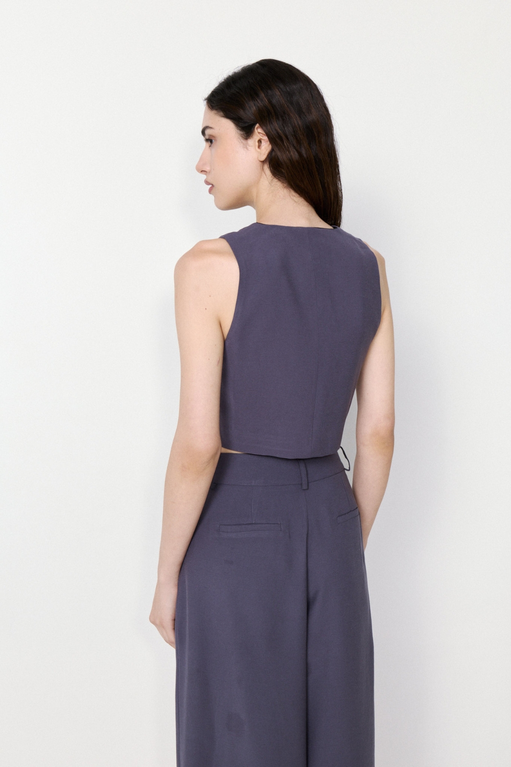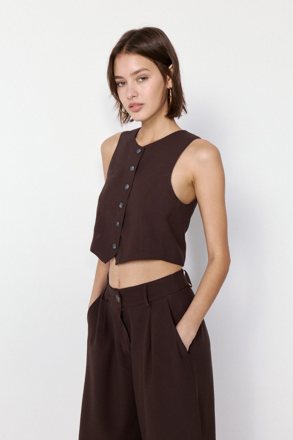 El CHALECO BARCADE es un chaleco sastrero en textil tipo tencel, de ajuste entallado que realza la figura. Su escote cerrado y forro al cuerpo aportan elegancia y confort.