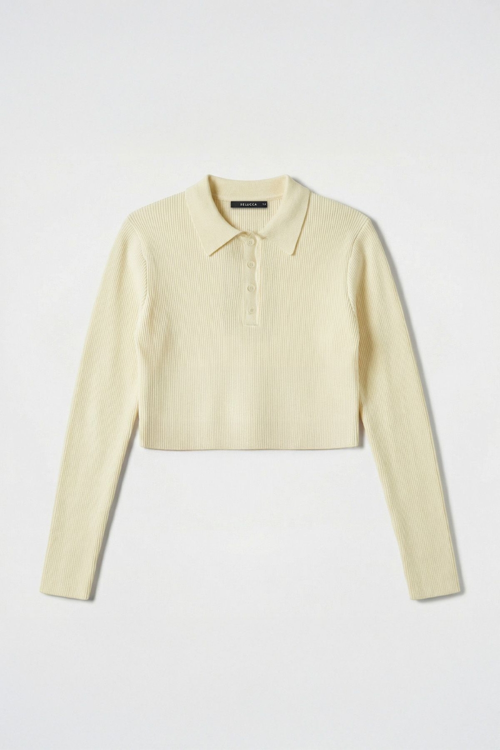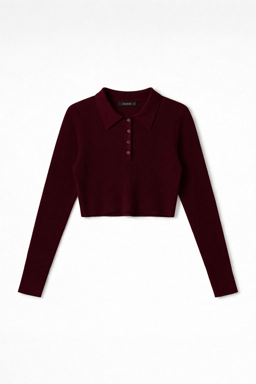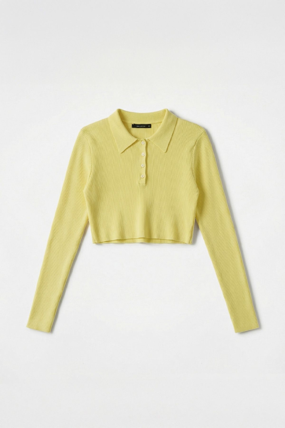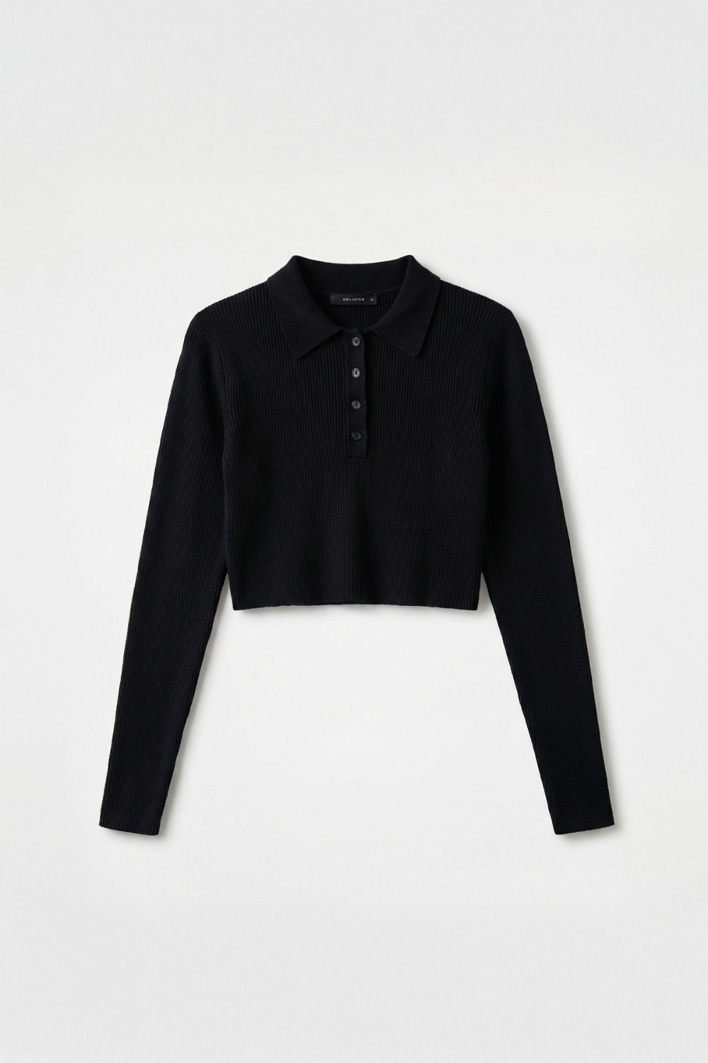 Chomba crop tejida en hilado de viscosa, calce ajustado con mangas largas ceñidas y escote con cartera de botones a tono. Largo hasta la cintura. Composición: 45% viscosa, 25% poliéster, 30% poliamida.