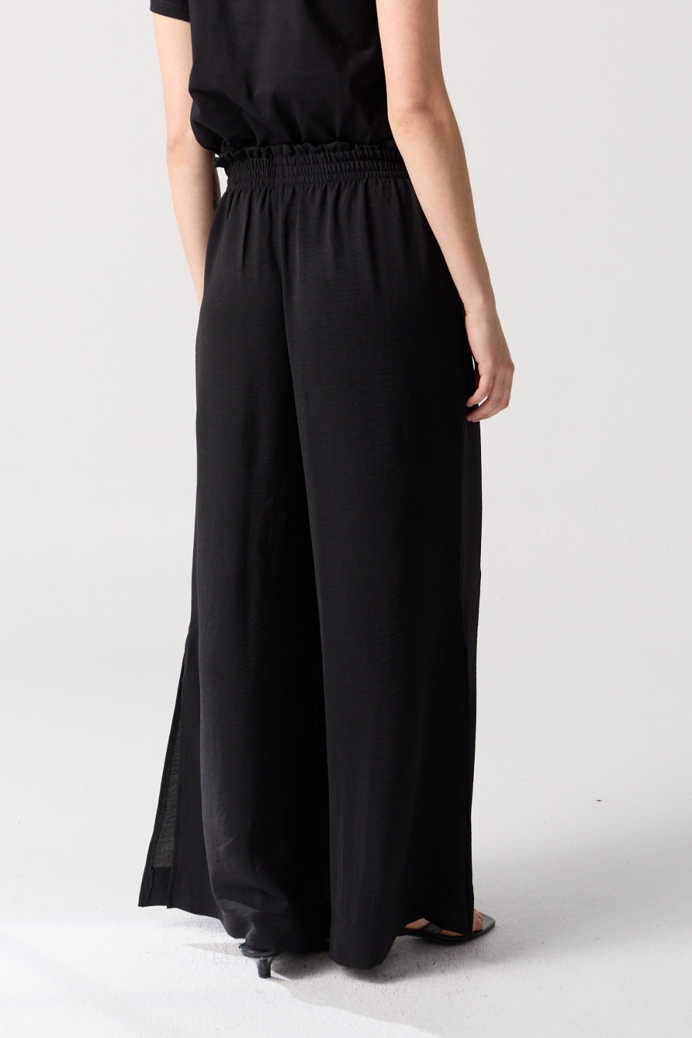 Pantalón suelto de pata ancha en textil linen look. Presenta cintura elastizada para mayor comodidad y tajo lateral que aporta un detalle moderno y sofisticado.