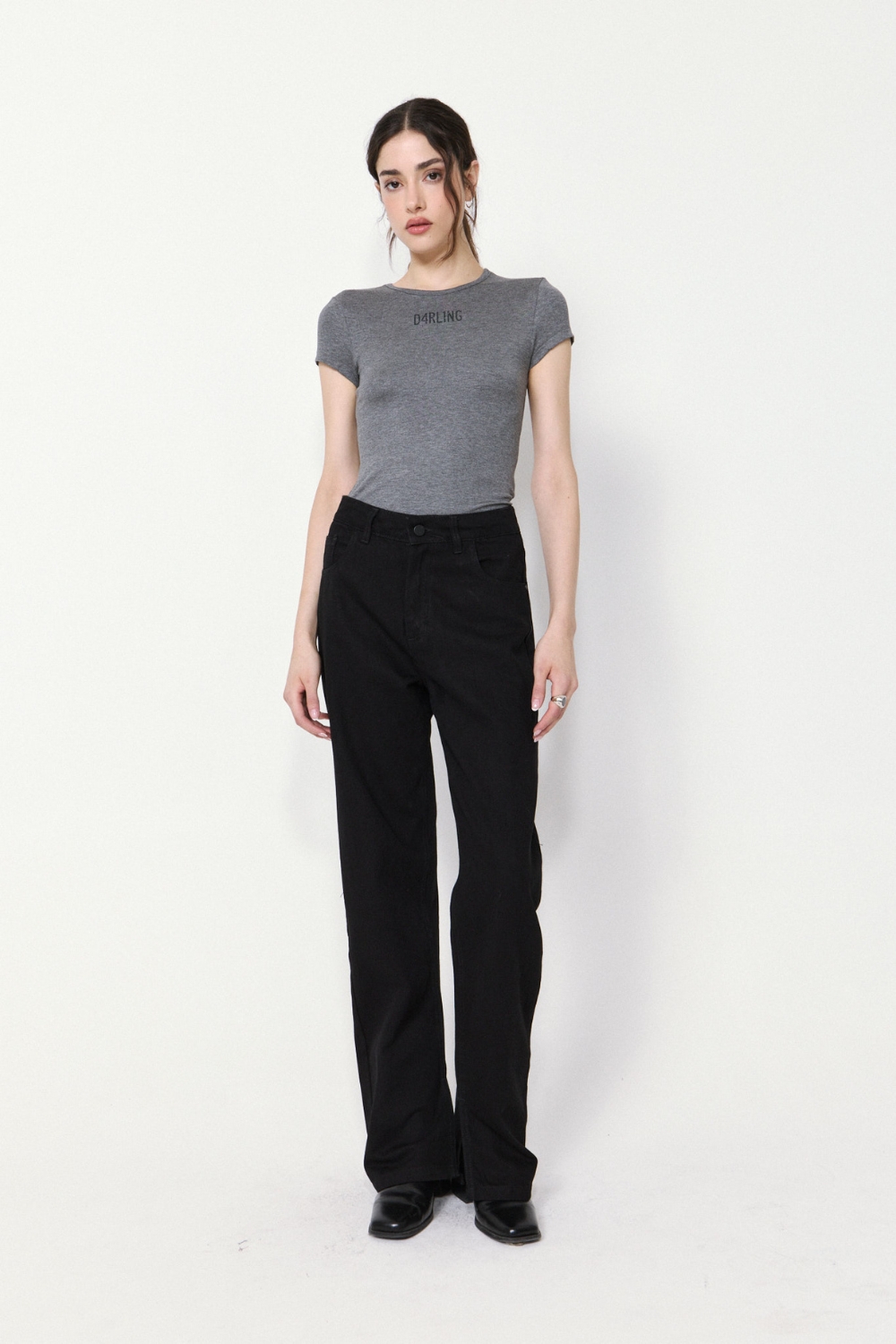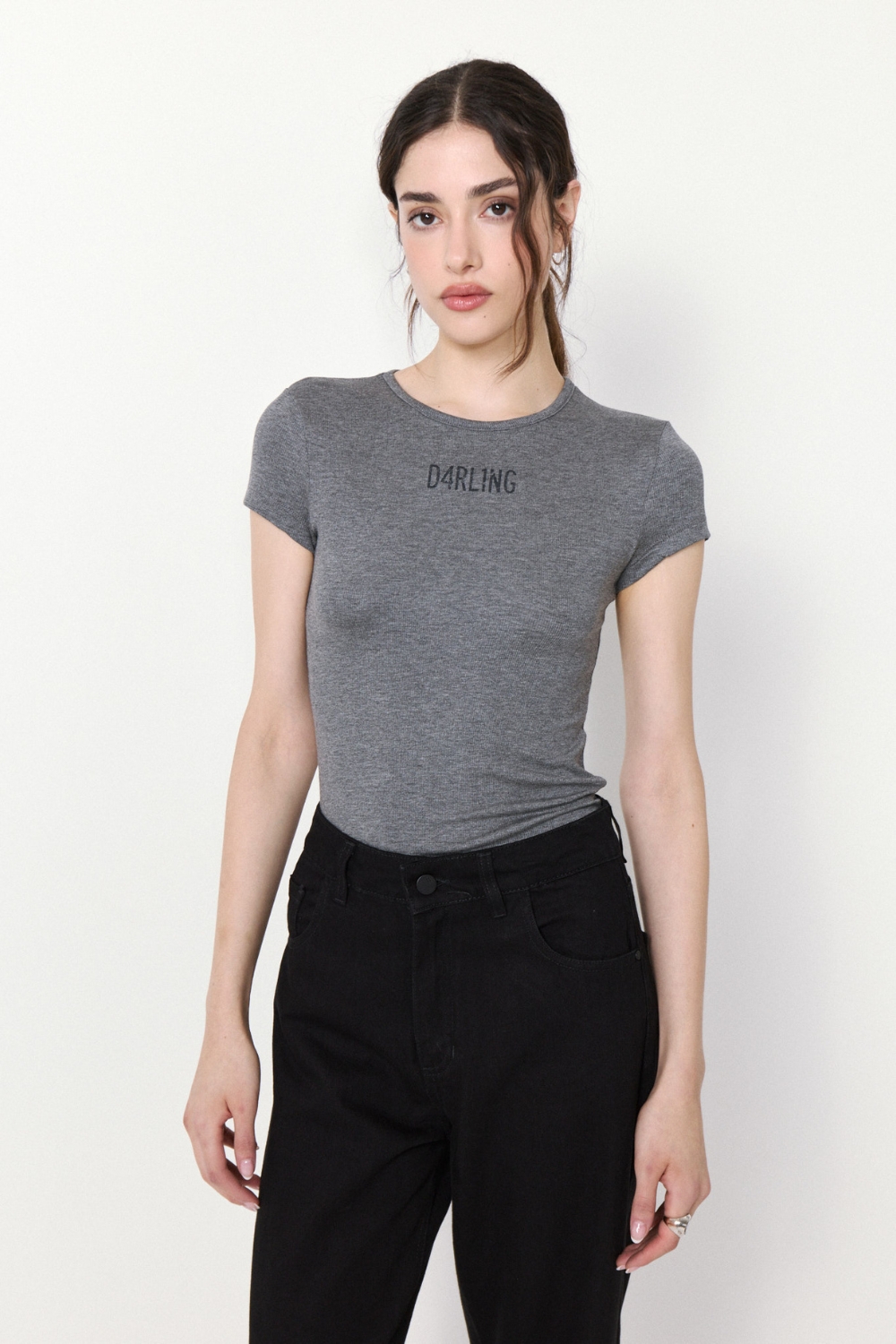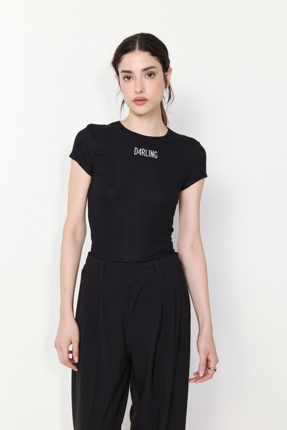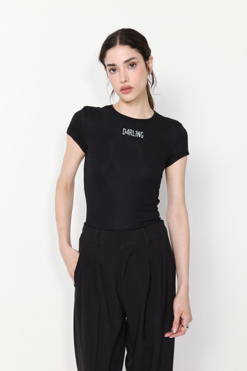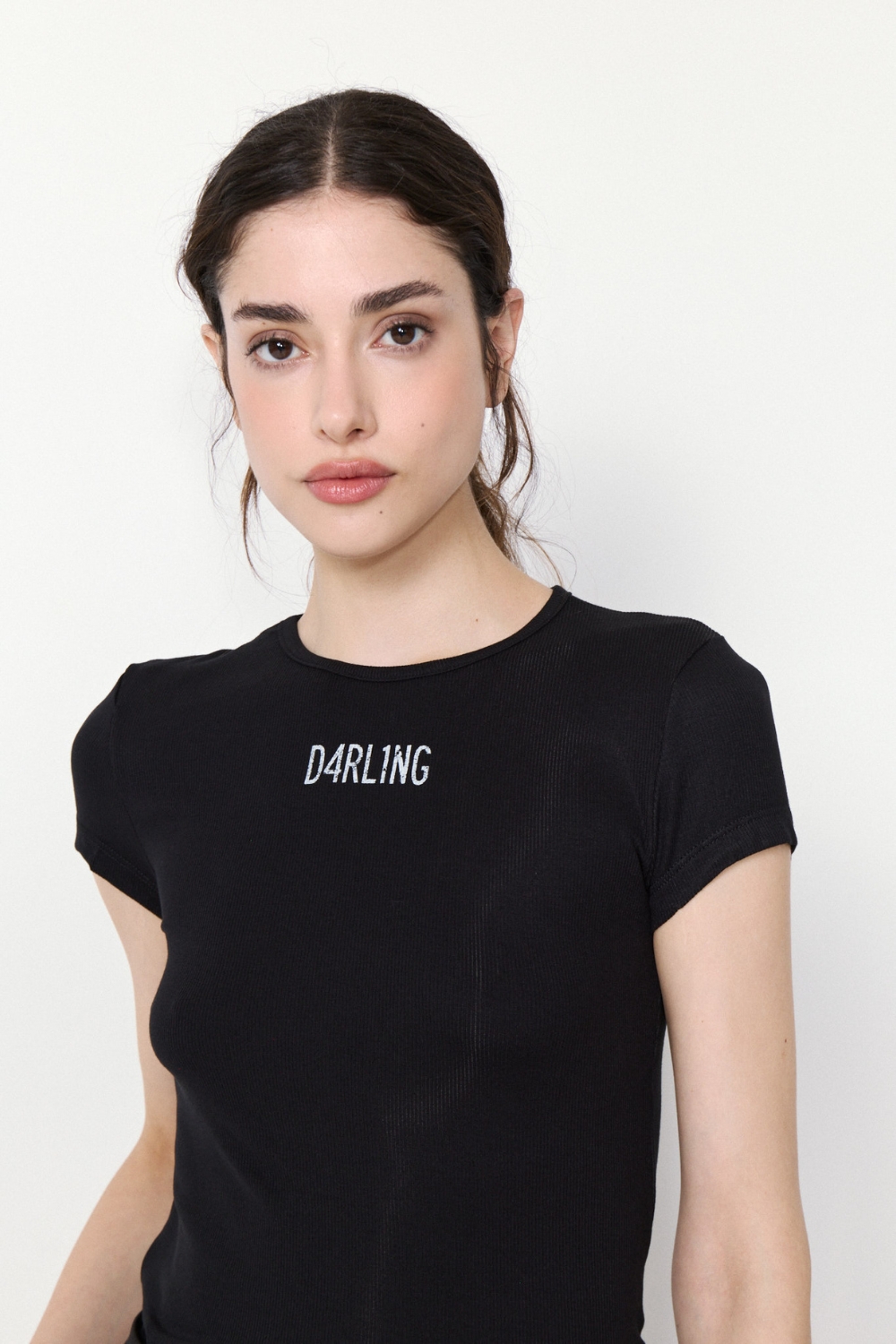 La REMERA DARLING es una prenda al cuerpo con escote redondo y manga corta. Confeccionada en ribb elastizado con viscosa, ofrece un ajuste cómodo y flexible.