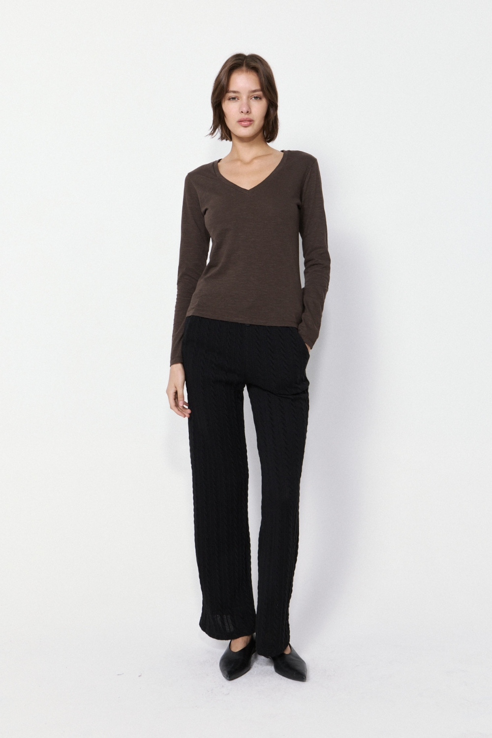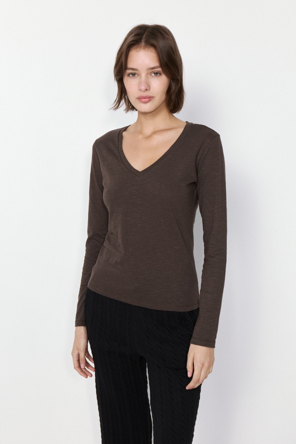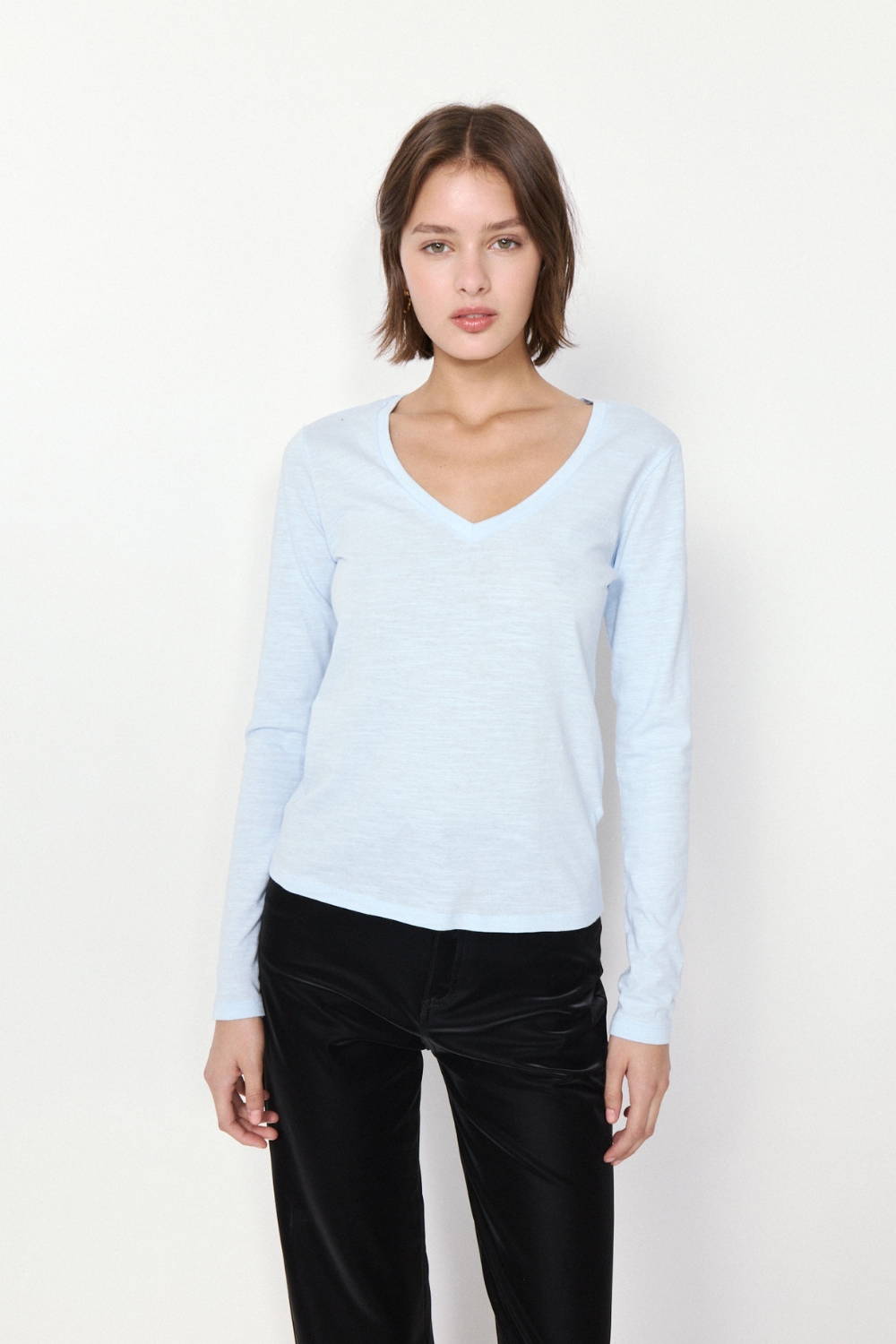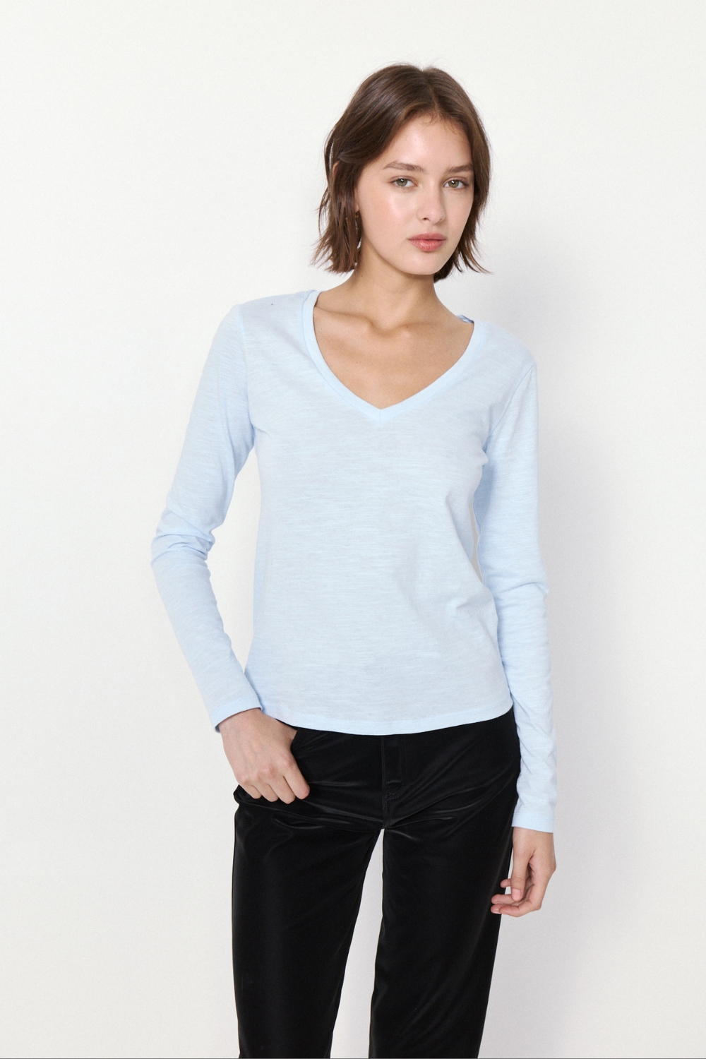 La REMERA DOMINIQUE es una prenda esencial en algodón flame, con calce relajado. Su escote en V y mangas largas aportan comodidad y estilo, con etiqueta estampada como detalle.