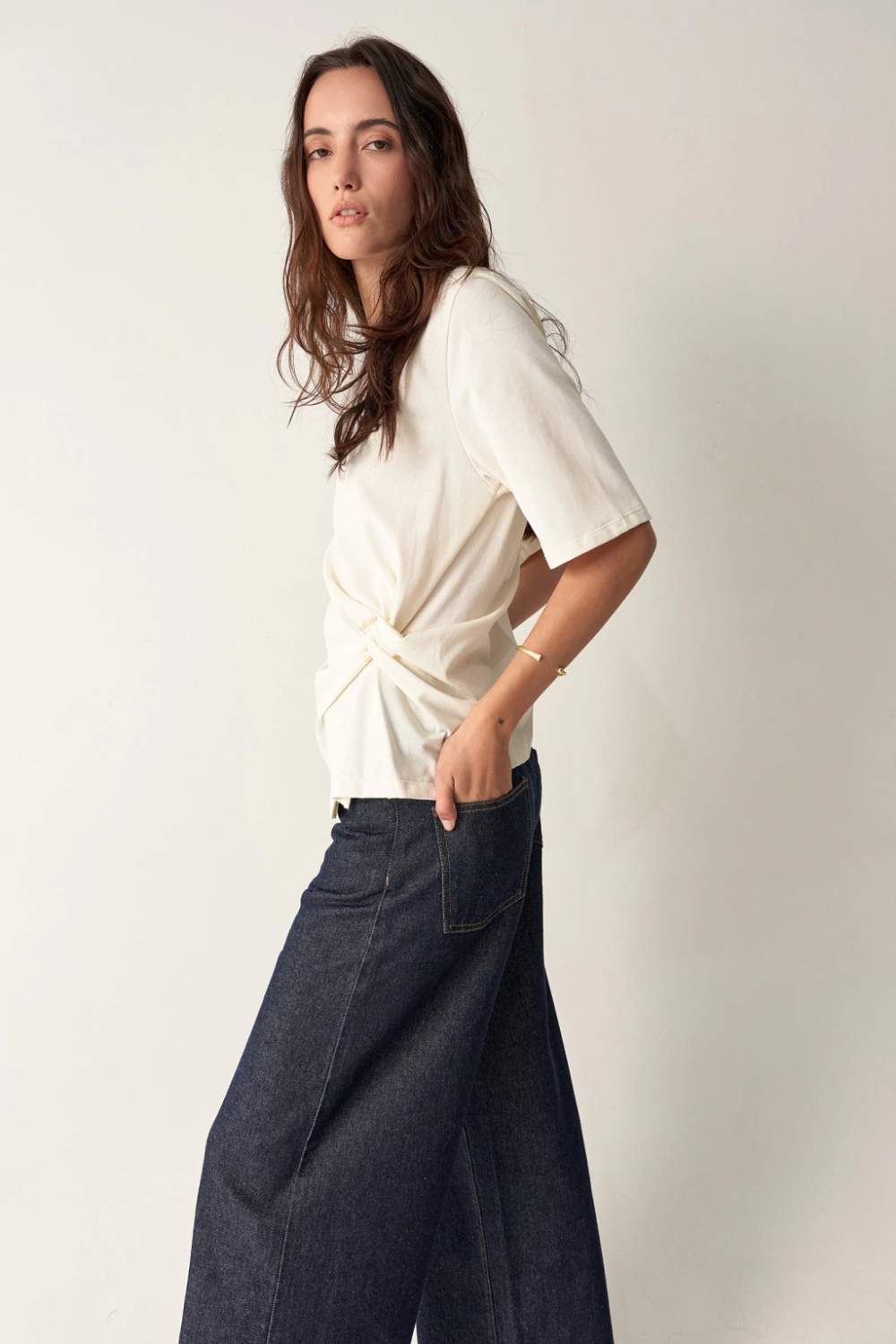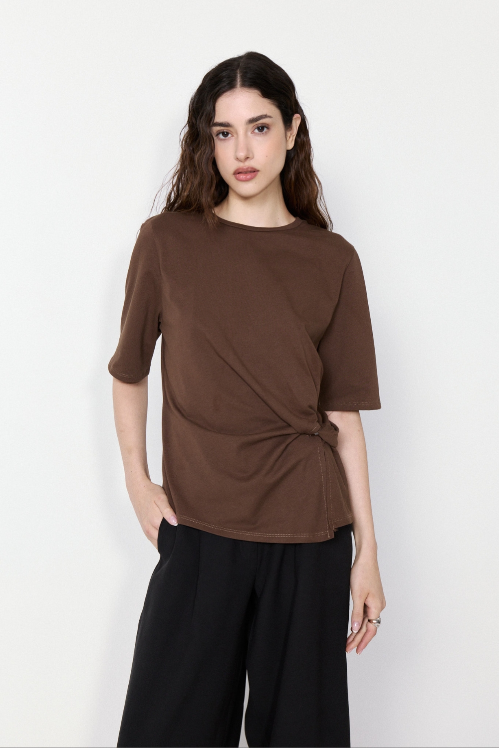 Remera MURRAY con diseño único y nudo en la cintura que aporta un detalle moderno. Su calce relajado brinda comodidad todo el día, mientras realza la figura de forma sutil.