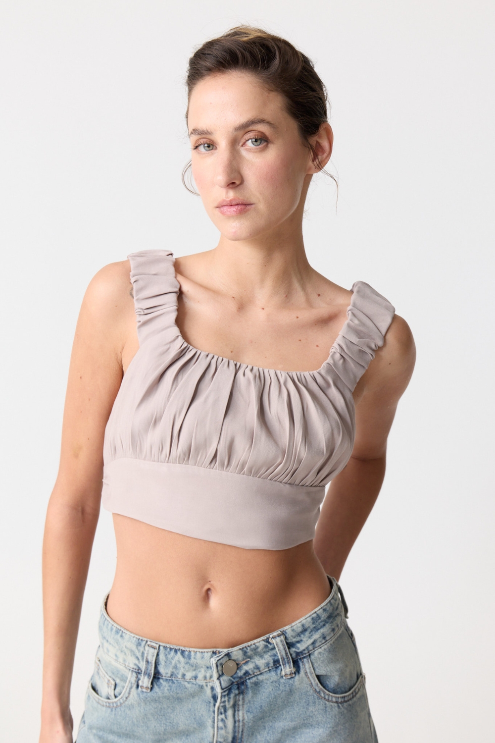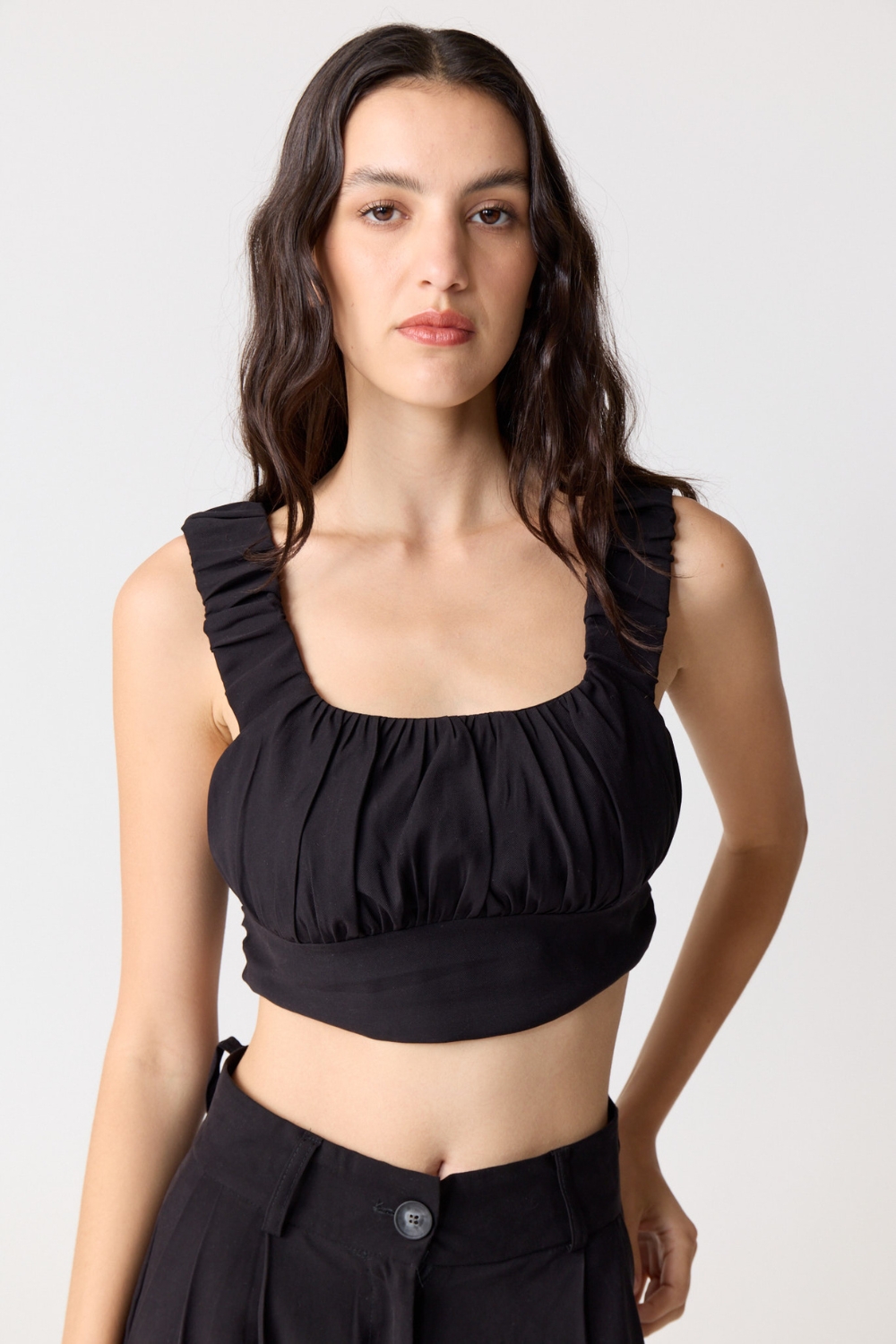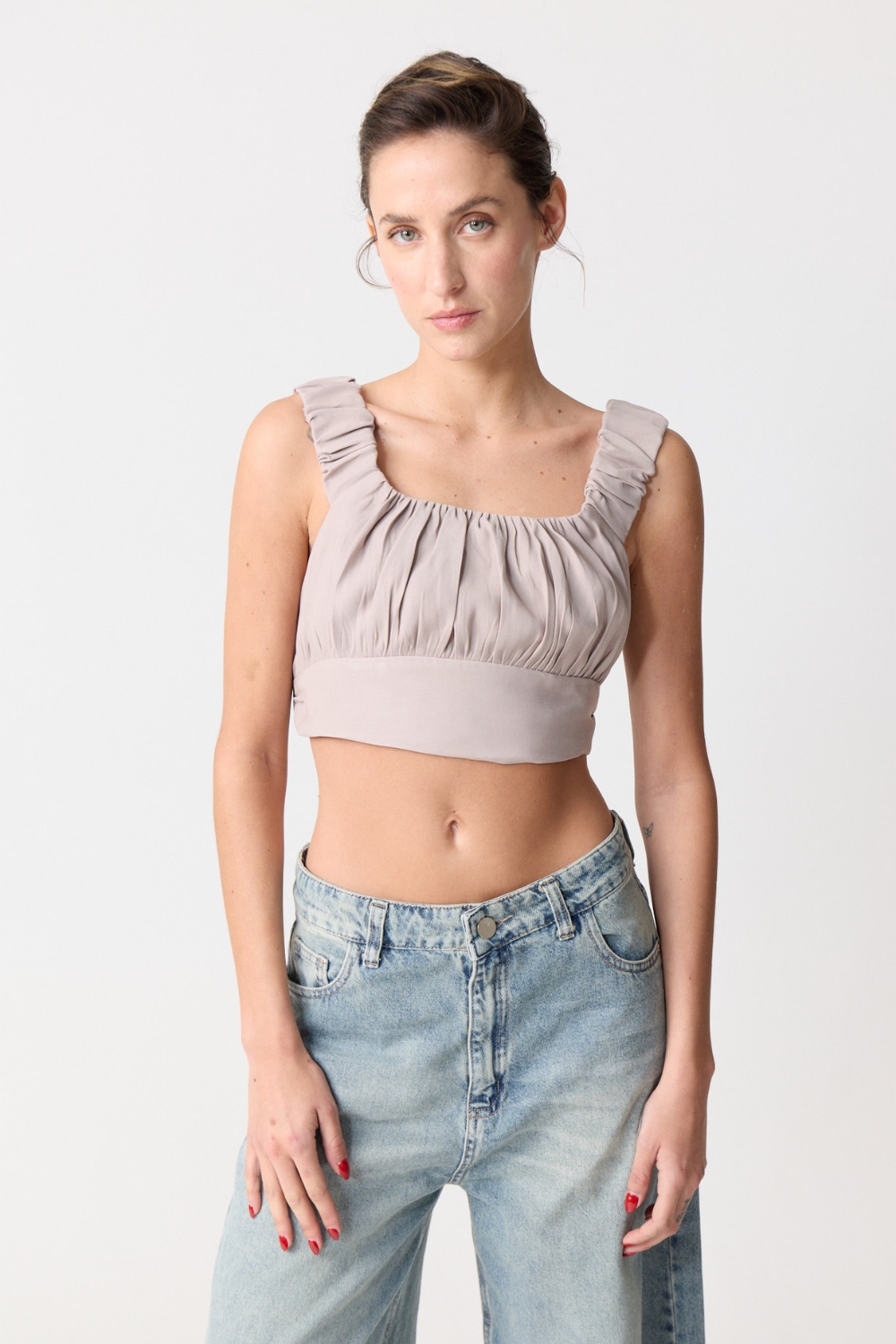 El TOP MINERVA es un top crop sin mangas que combina estilo y comodidad. Con nudo en el busto, breteles anchos y seda elastizada, ofrece suavidad, soporte y un ajuste perfecto para cualquier ocasión.