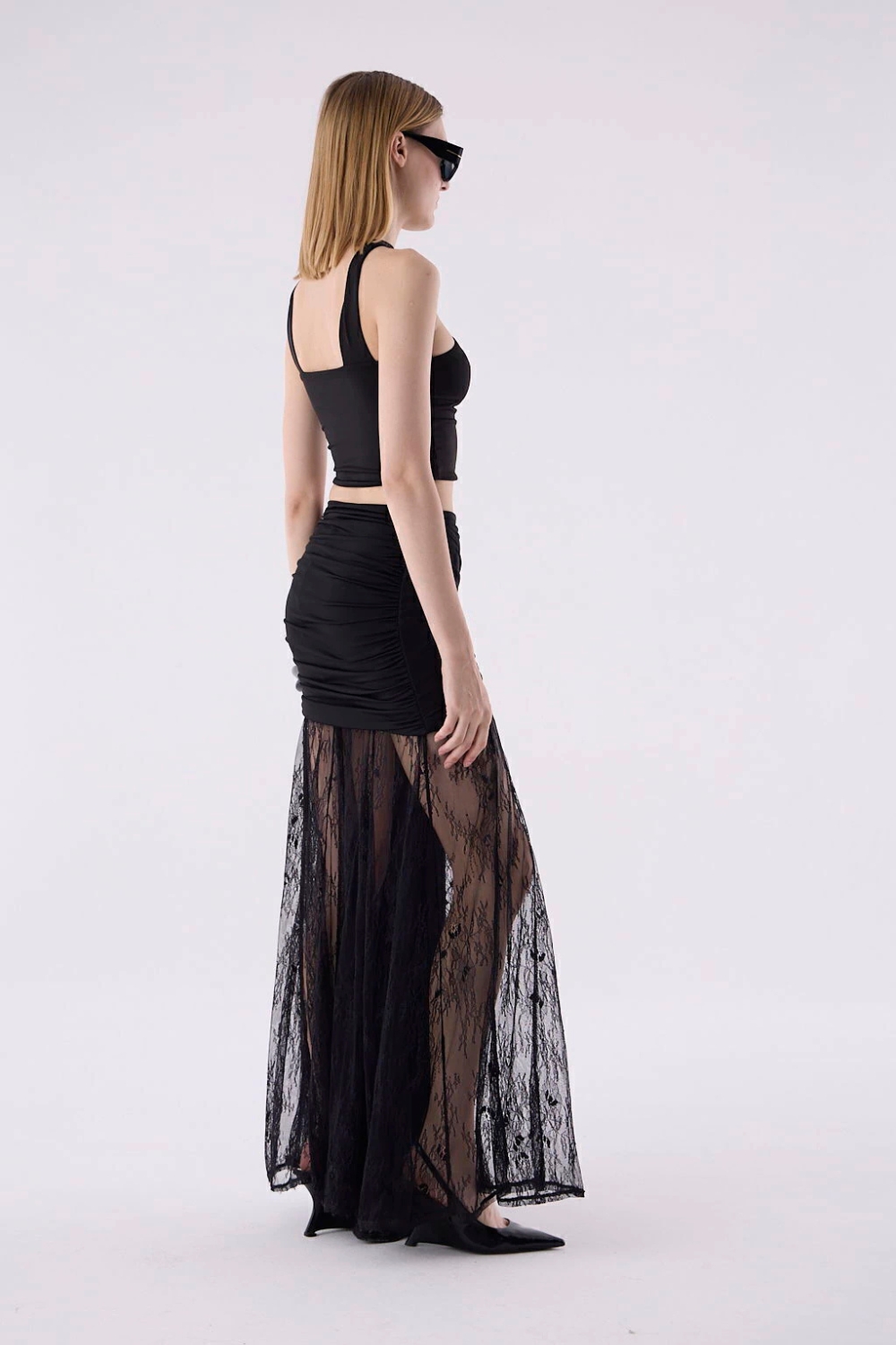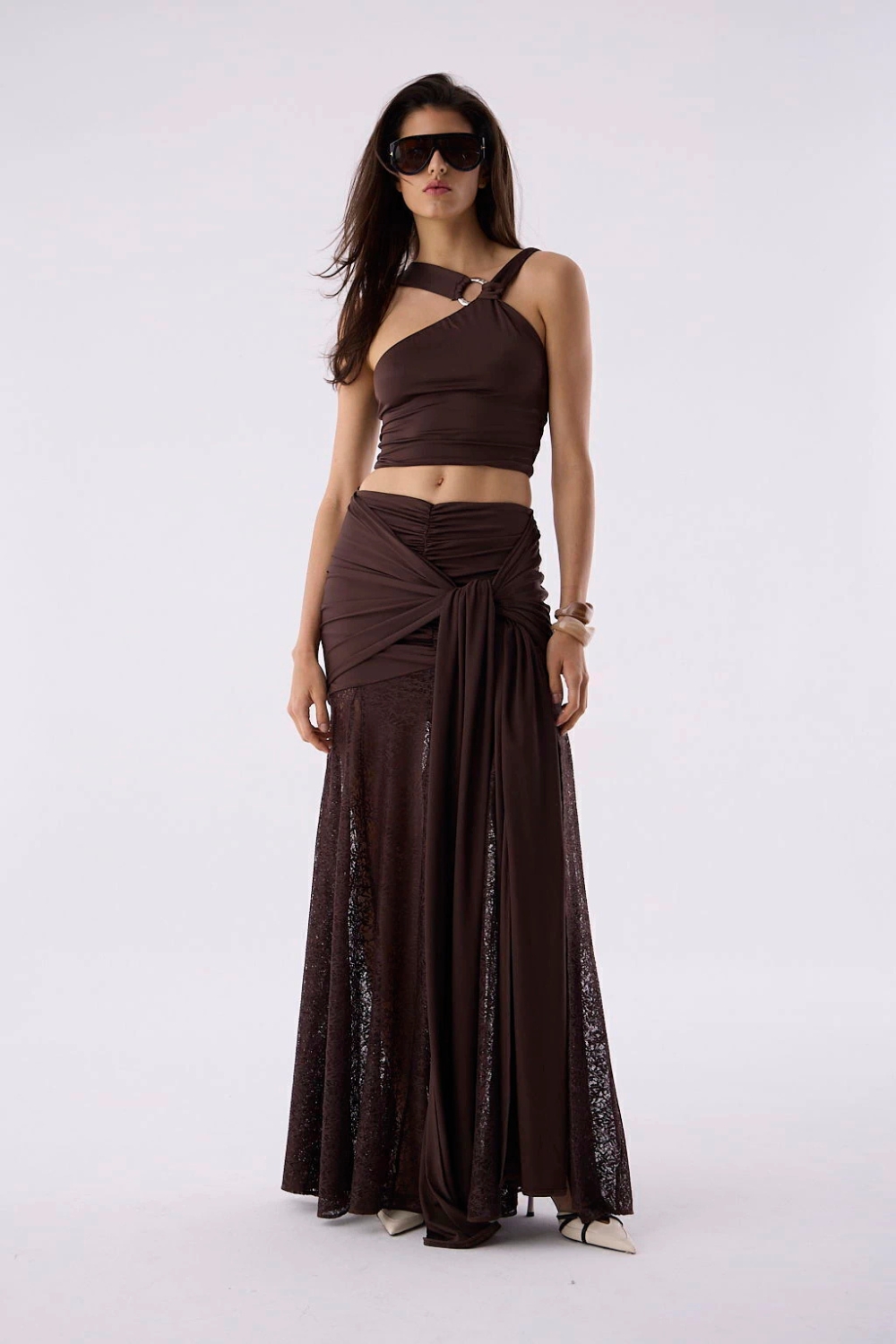 Top asimétrico de un solo hombro con avío metálico decorativo y breteles anchos. Calce ceñido y totalmente forrado. Confeccionado en jersey creppe.