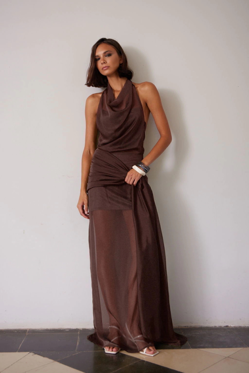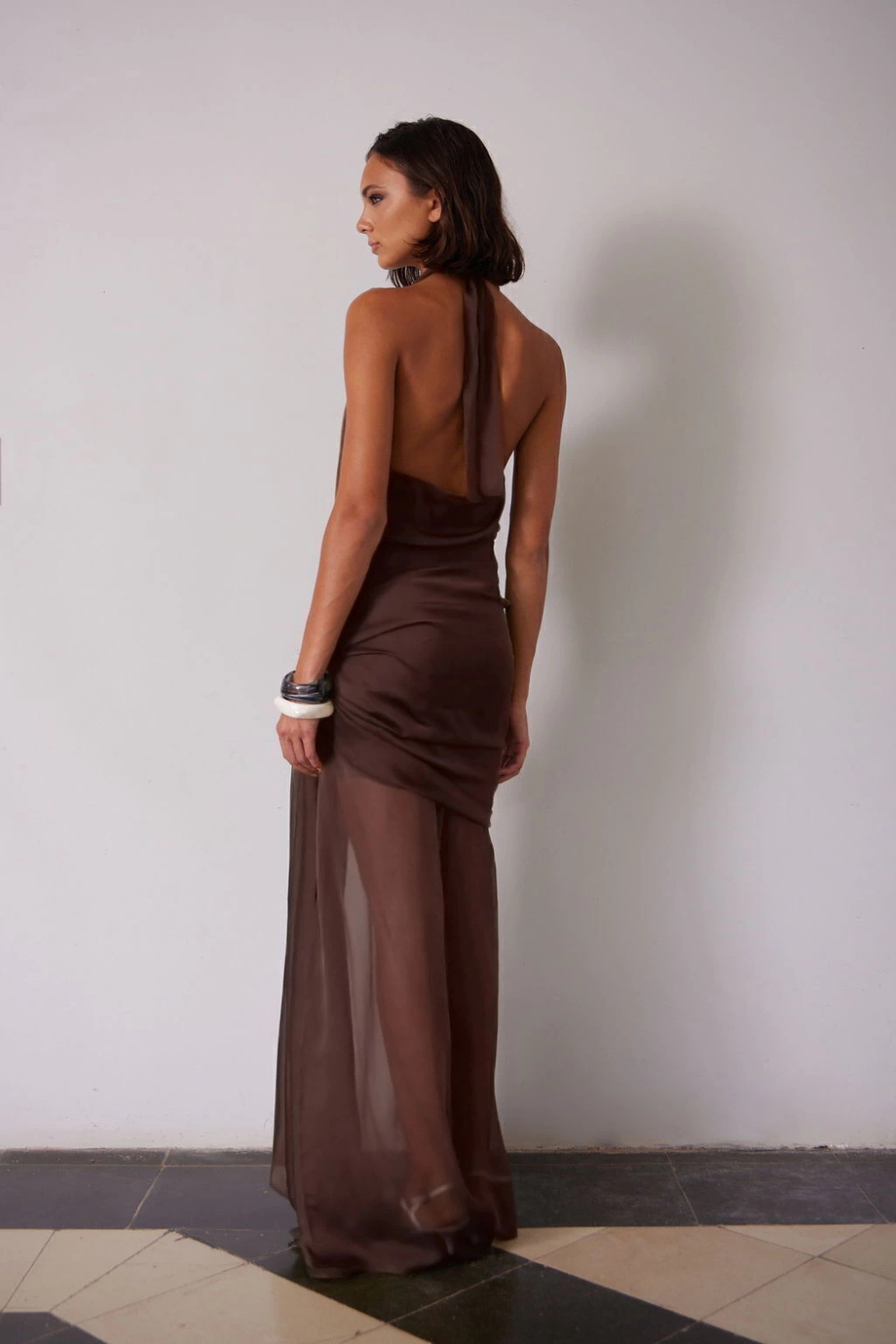 Vestido largo halter tipo buche con transparencias y lazo detrás del cuello. Falda recta con sobrefalda fija para atar estilo pañuelo. Confeccionado en gasa tornasol.