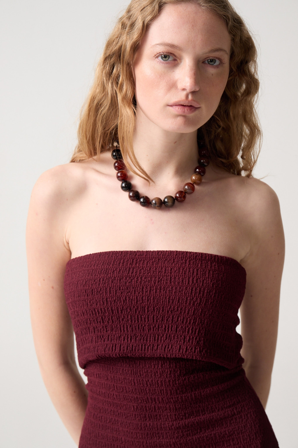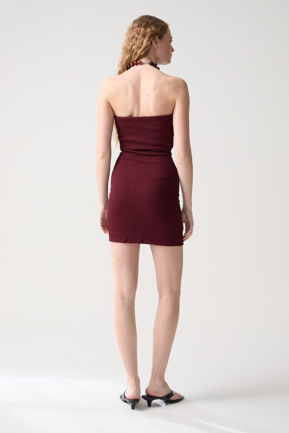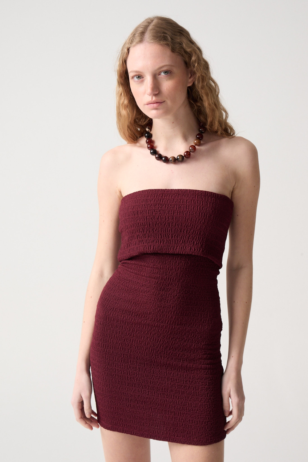 El Vestido Cibeles es un diseño strapless con escote volcado que realza la figura con elegancia. Su textil texturado elastizado y ajuste al cuerpo brindan comodidad y un look moderno y femenino.
