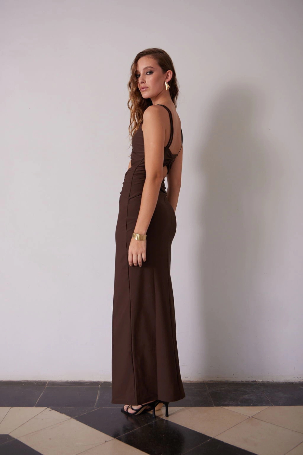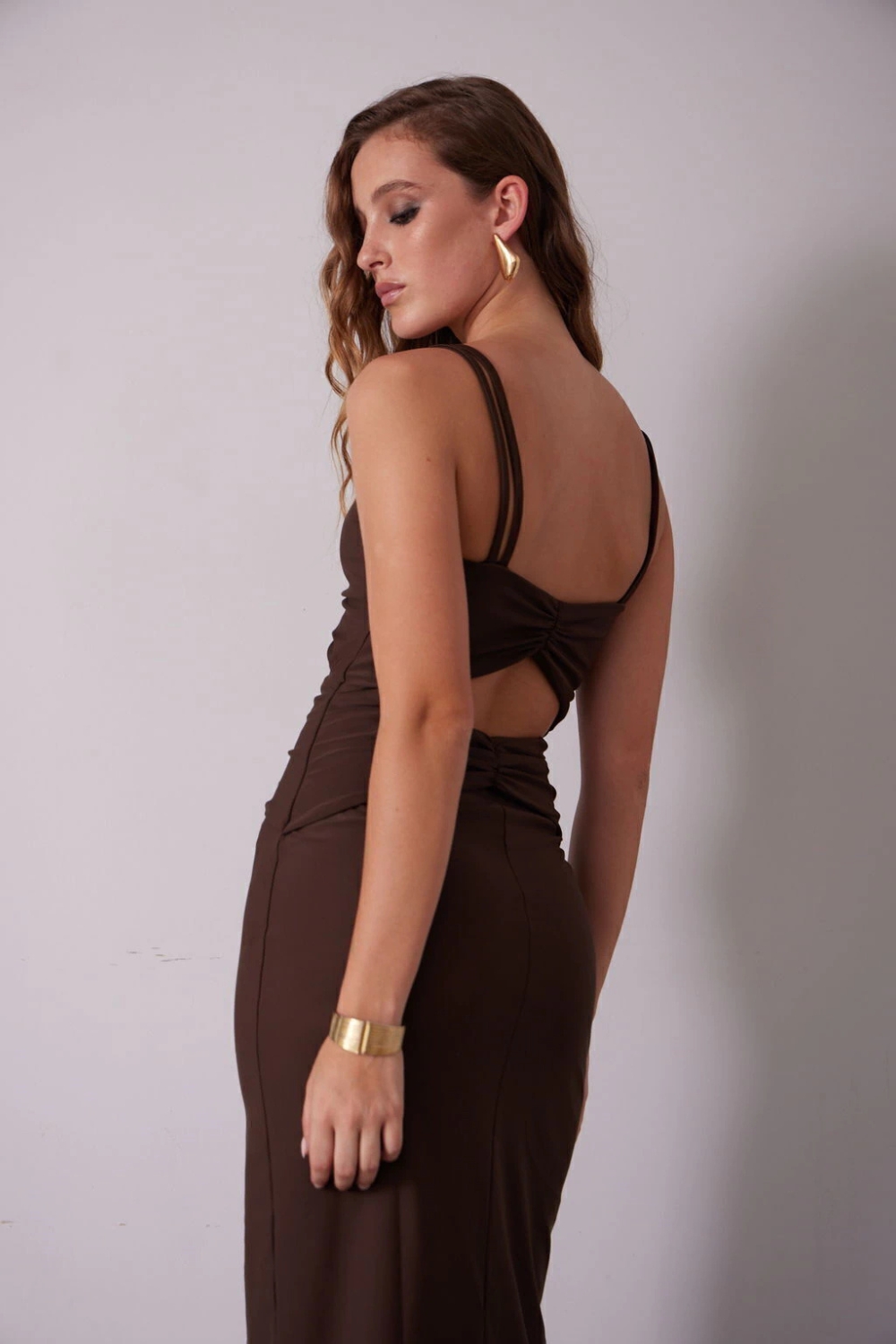 Vestido largo con breteles finos y corpiño con frunces que realzan la figura, acompañado de un recorte en la cintura. Su falda cuenta con un tajo en el centro del bajo delantero, aportando movimiento y estilo. Diseñado para un calce ceñido, está confeccionado en tricot de lycra, combinando comodidad y elegancia en un diseño moderno.
